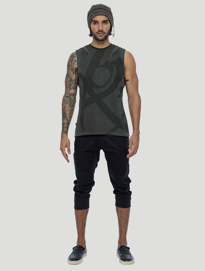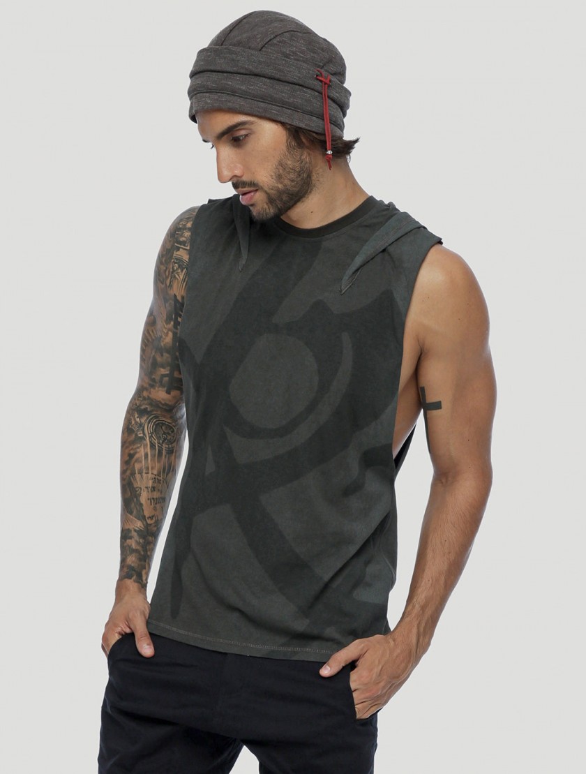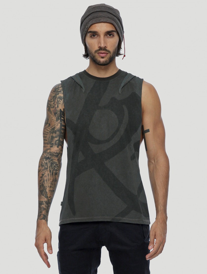 * Sleeveless tee with an attached slouchy hood.