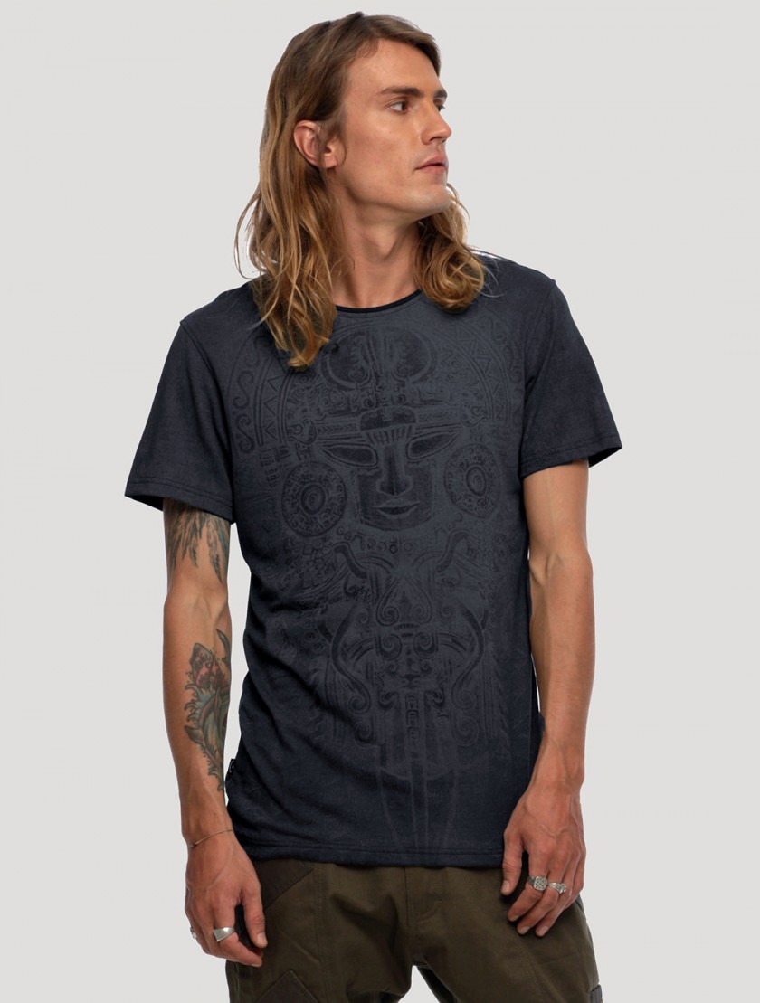 * All-over "washed" look print design, inspired by ancient Maya artwork.