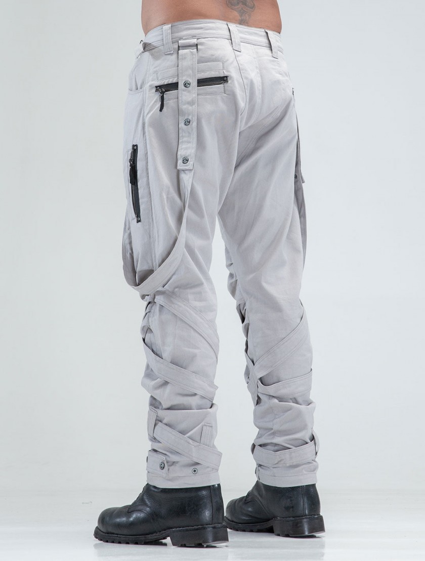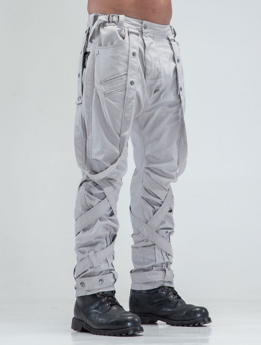Stand out from the crowd in this edgy pair. Straight-leg long trousers with low crotch silloutthe. Full of hand-made, removable and adjustable details + 7 pockets. You will not want to take these off!