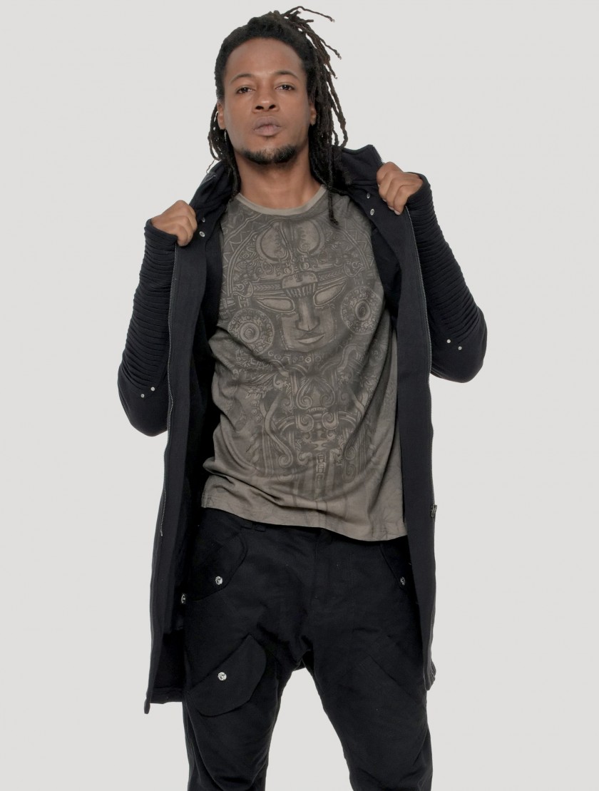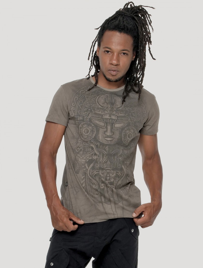 * All-over "washed" look print design, inspired by ancient Maya artwork.